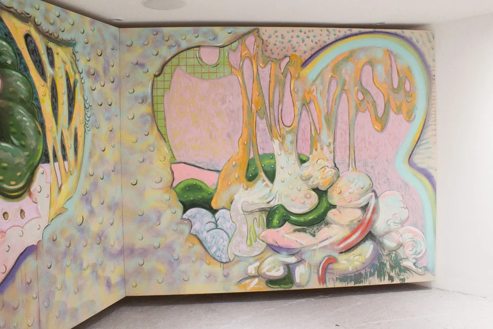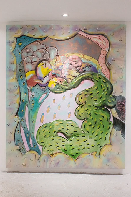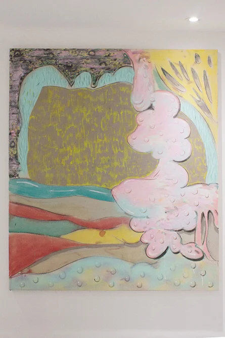 Oil, distemper, spray paint and charcoal on canvas